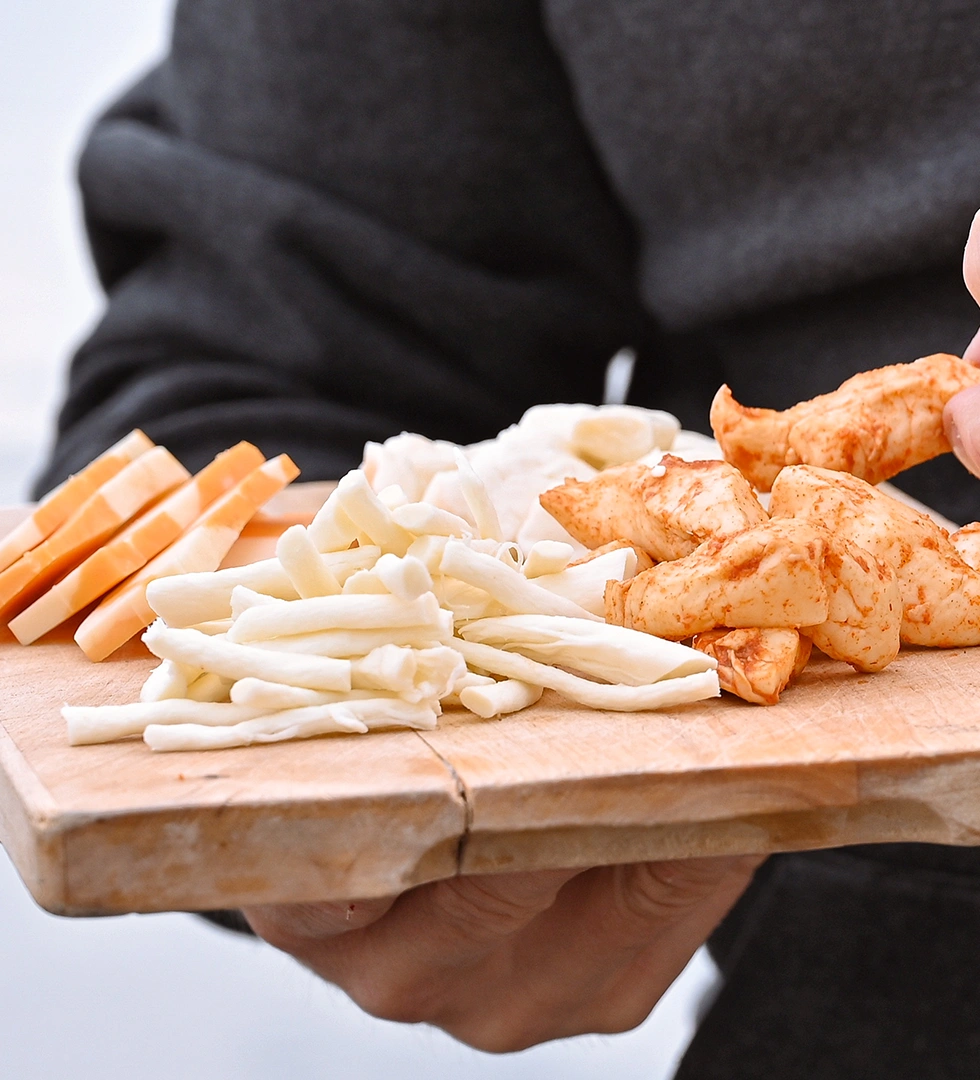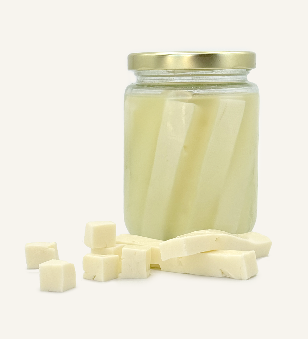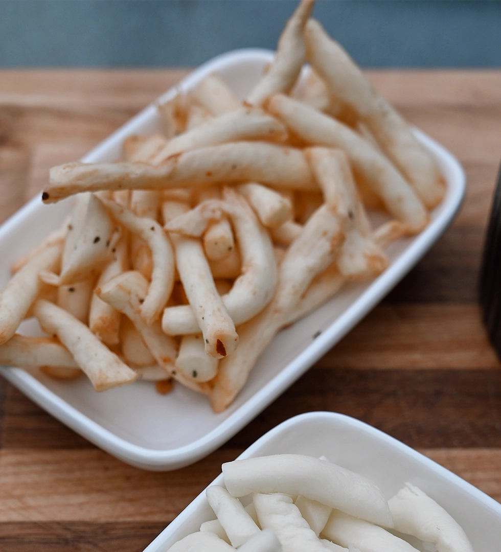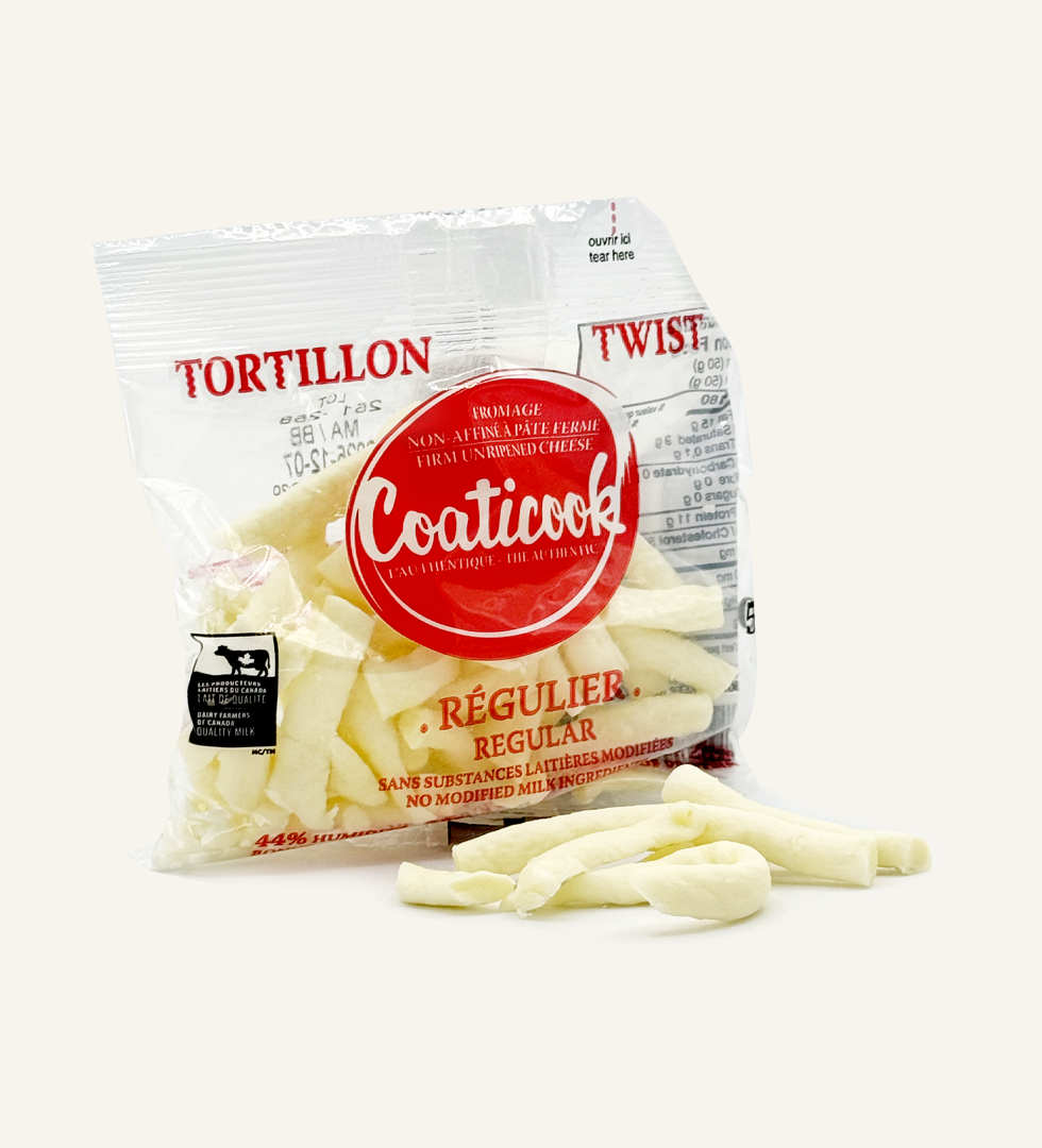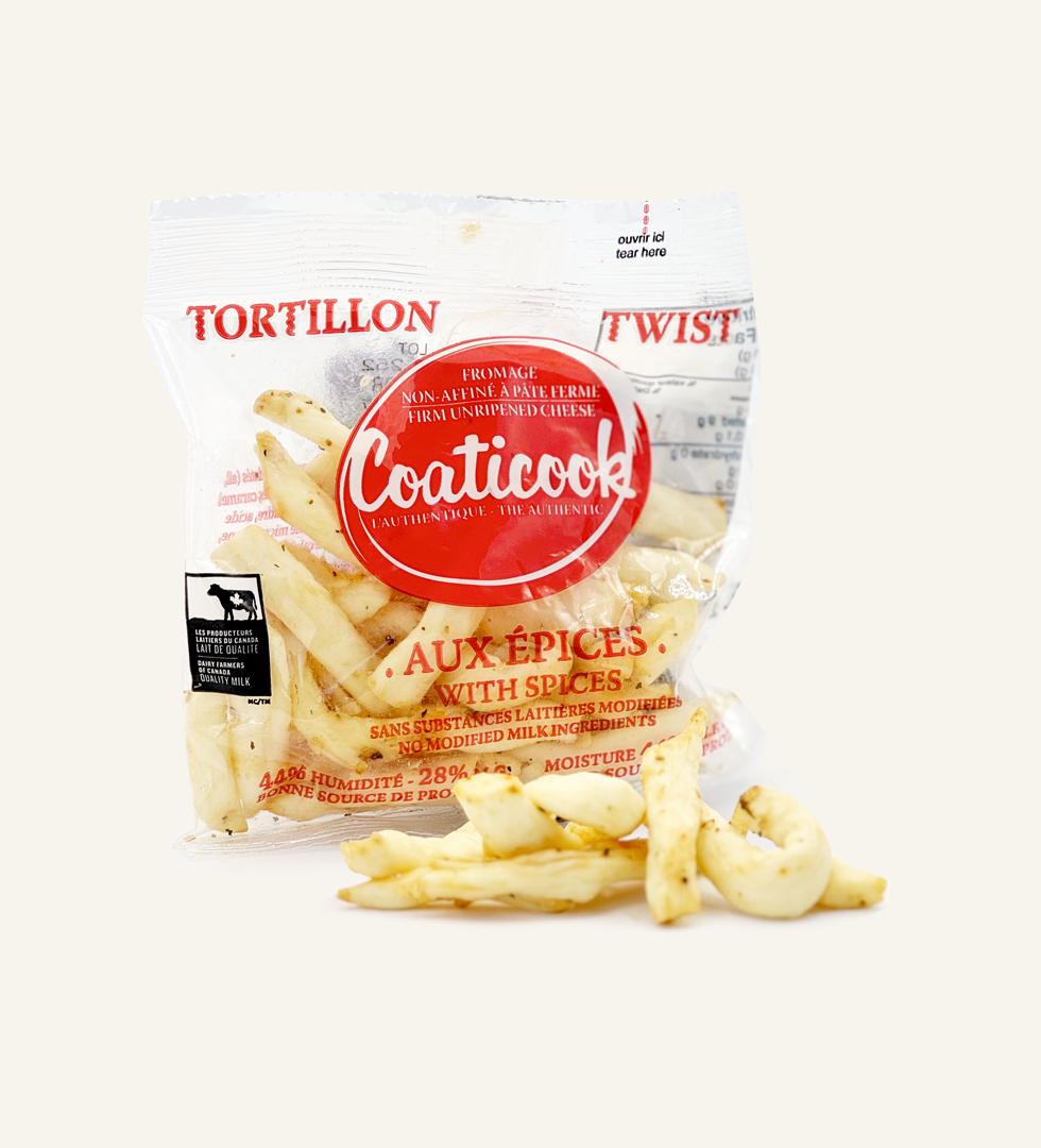 Made from mild cheddar cheese, the cheese is heated and stretched into long strands before being cut into small pieces and immersed in salt water. They are then removed from the brine and twisted into their characteristic shape.
